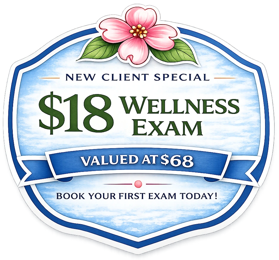 *Offer valid for new clients’ first exam only. Limit one pet per household. Appointments are required; walk-ins and same-day visits are not accepted. Please call our team with any questions or to schedule.